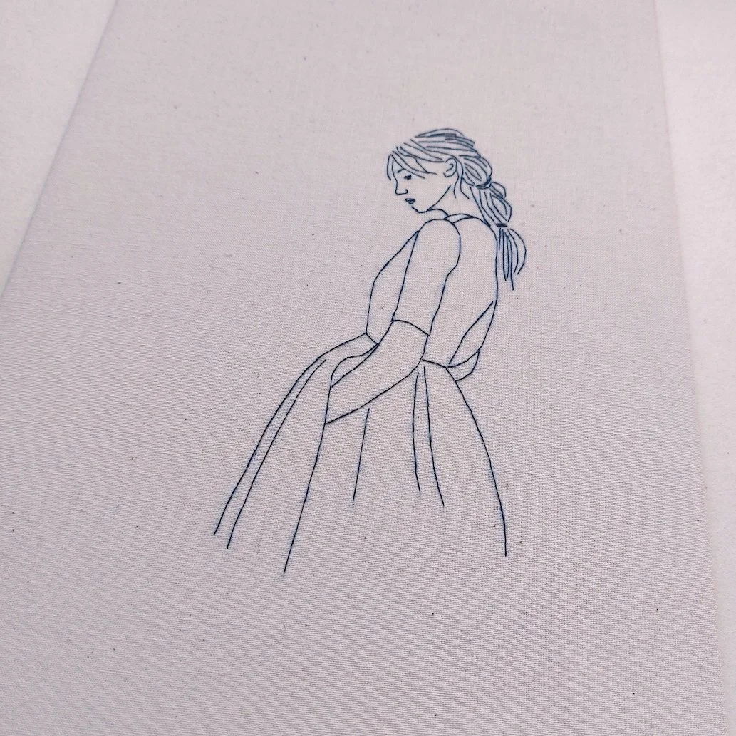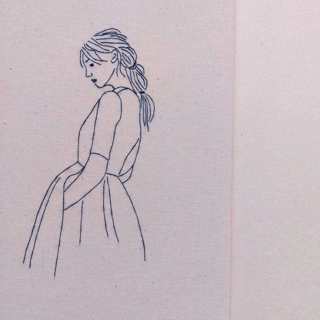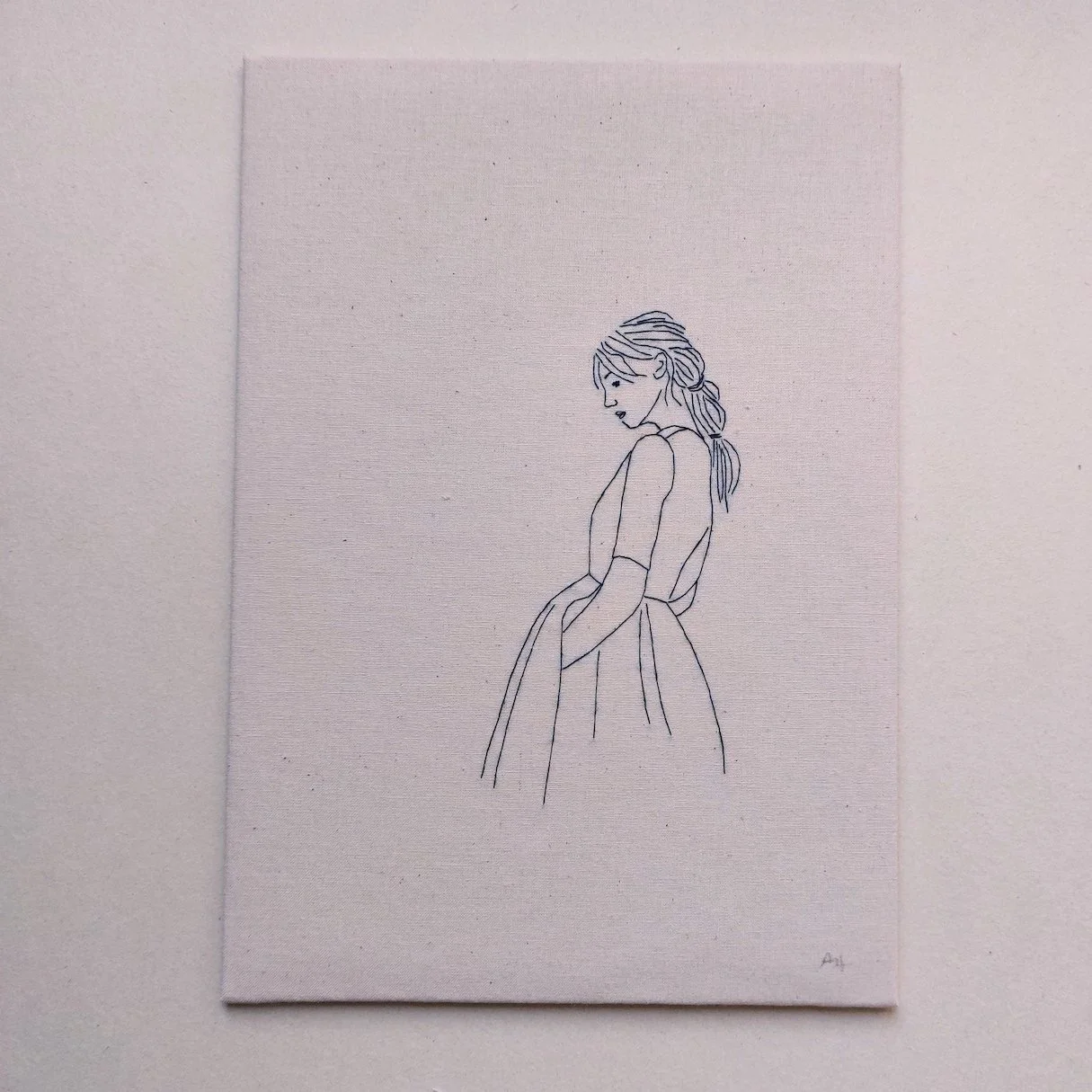 Ce dessin brodé moderne apporte une touche féminine à la décoration de votre intérieur. Il illustre la délicatesse et l’élégance dans cette silhouette de femme de profil en robe à poche, les cheveux légèrement lâchés, l’air décidé.