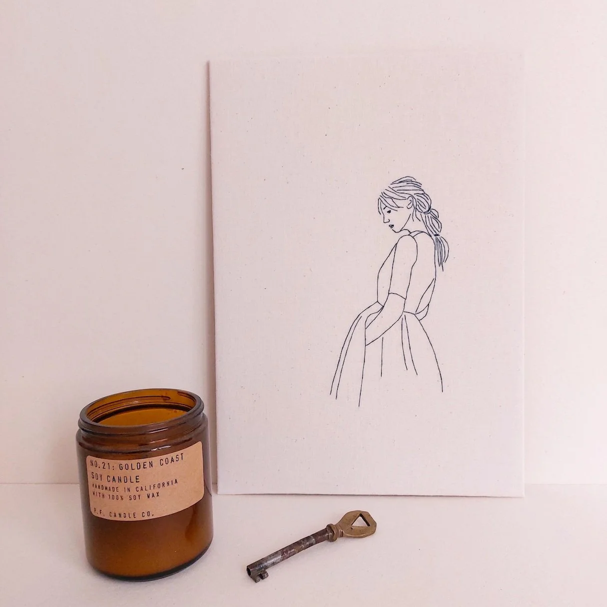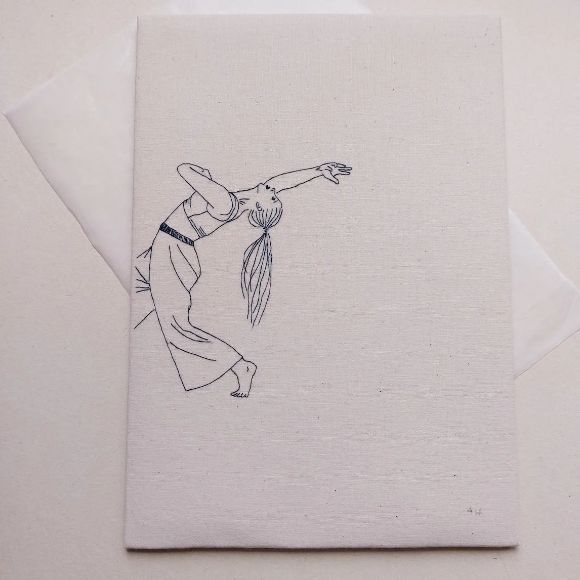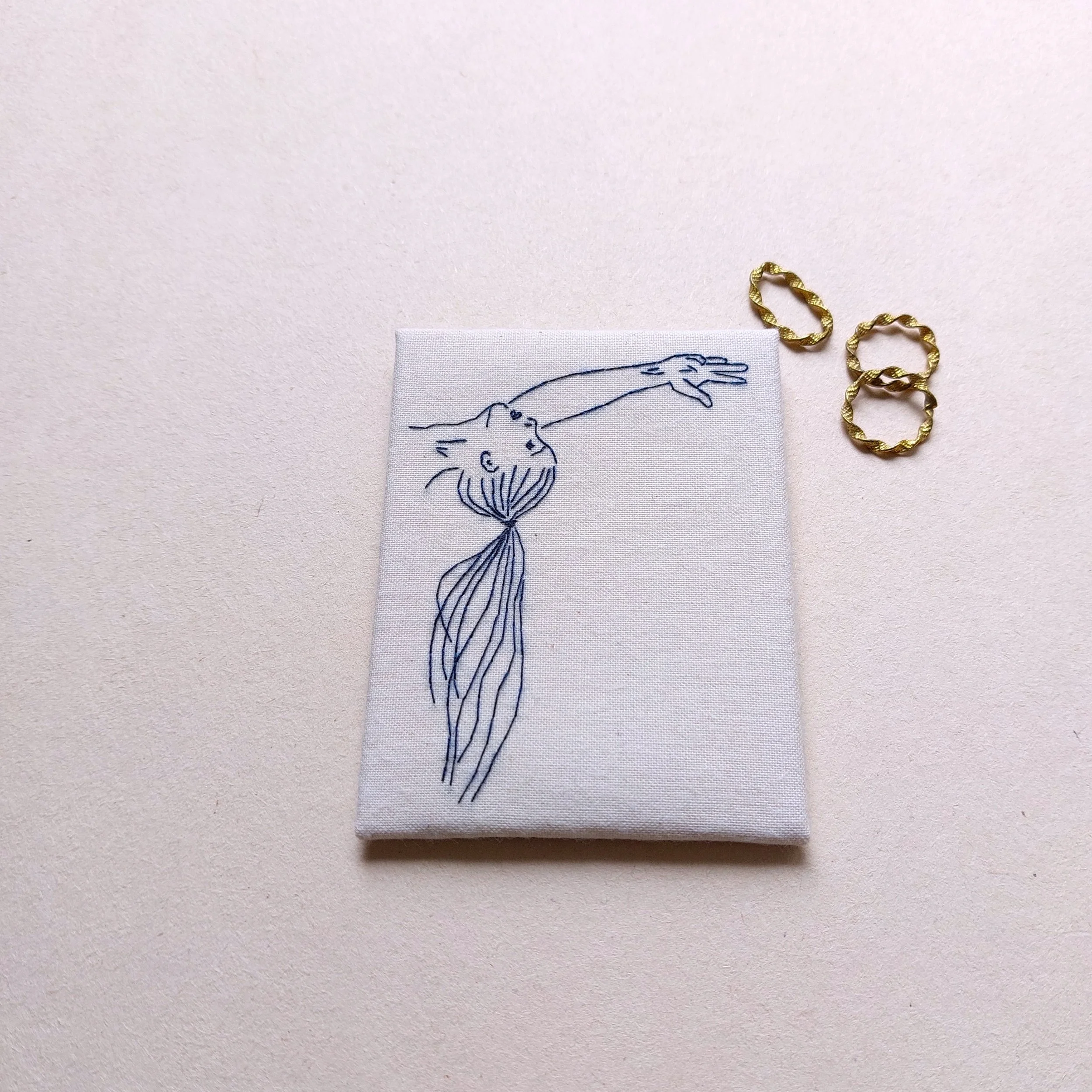 Cette broderie contemplative est réalisée à la main avec soin sur une toile de coton brut, sans traitement chimique. Le dessin brodé est effectué avec un fil de polyester bleu marine, une couleur à la fois sobre et intemporelle, qui apporte une élégance discrète à l’ensemble. Une fois la broderie terminée, elle est délicatement tendue et rigidifiée sur un carton de bois, ce qui assure une présentation soignée et un maintien parfait. Le tout est ensuite fixé à l’aide d’un adhésif et d’une bande de kraft gommé, pour garantir la stabilité et la pérennité de l'œuvre.
