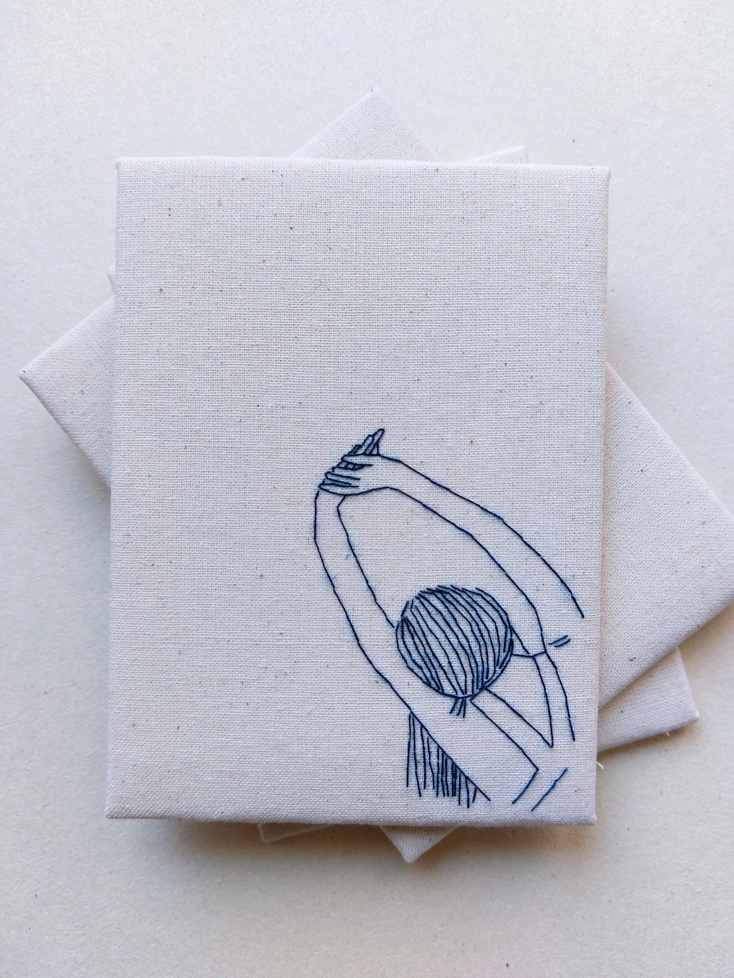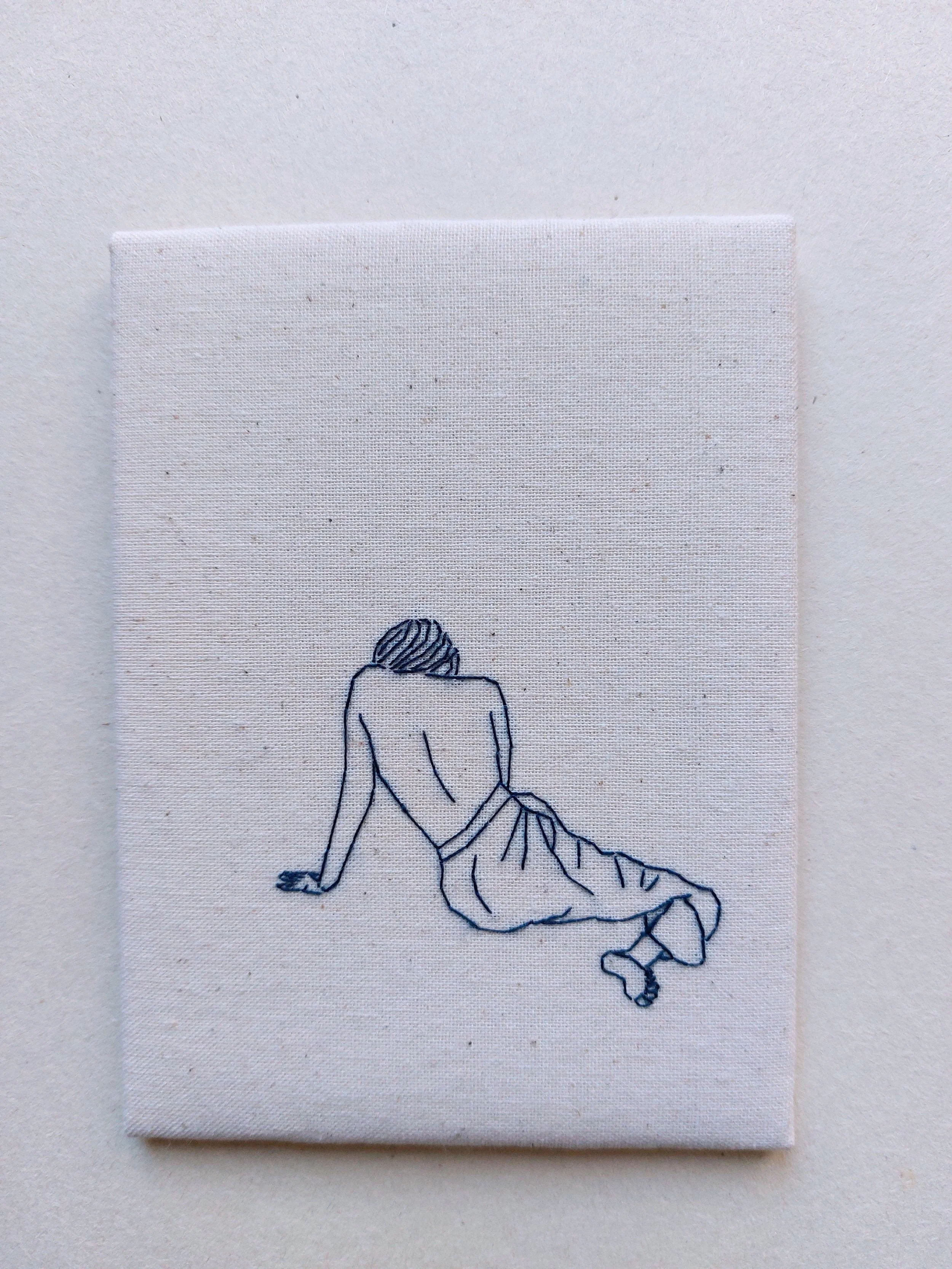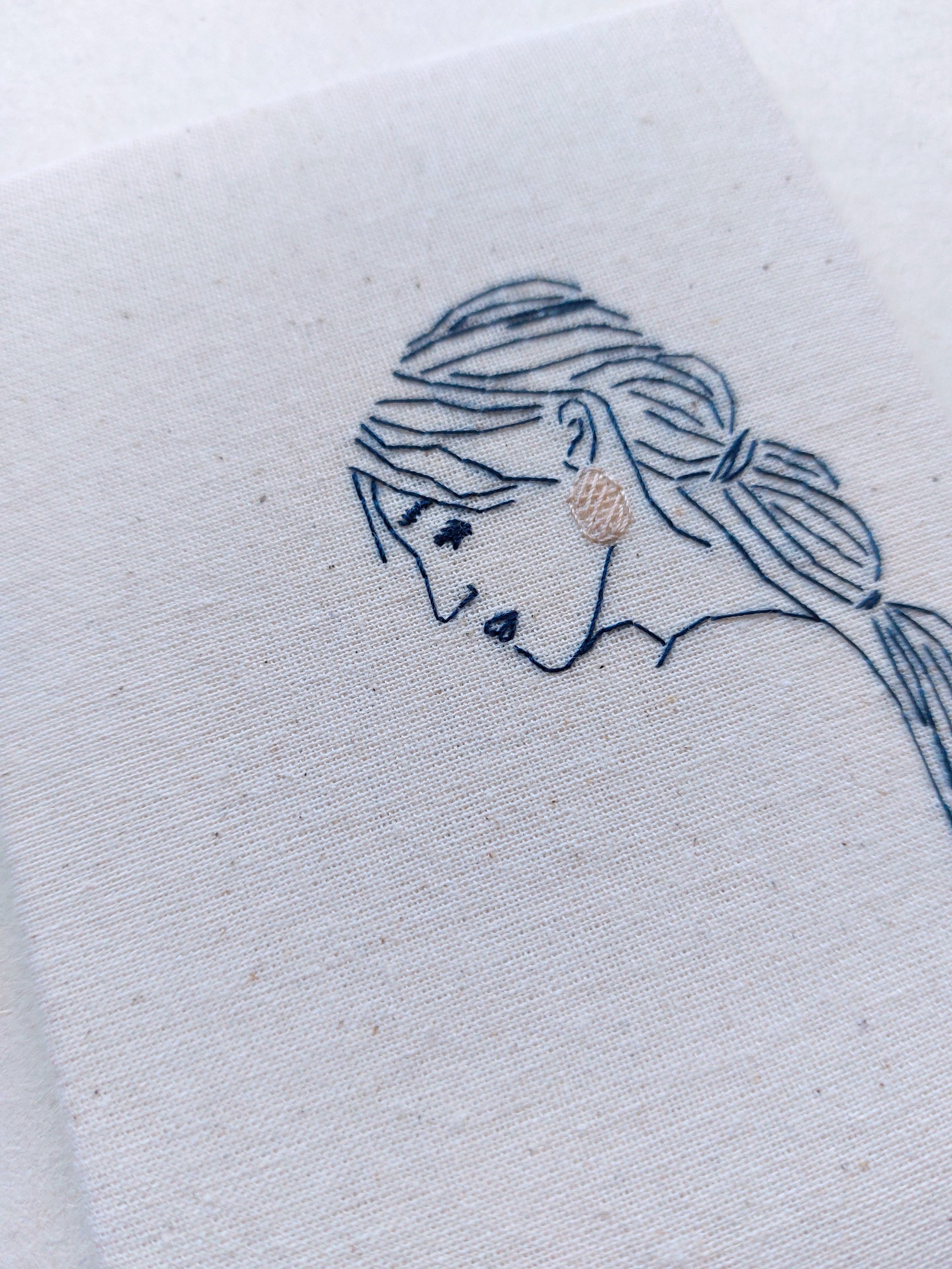 Cette broderie contemplative est réalisée à la main avec soin sur une toile de coton brut, sans traitement chimique. Le dessin brodé est effectué avec un fil de polyester bleu marine, une couleur à la fois sobre et intemporelle, qui apporte une élégance discrète à l’ensemble. Une fois la broderie terminée, elle est délicatement tendue et rigidifiée sur un carton de bois, ce qui assure une présentation soignée et un maintien parfait. Le tout est ensuite fixé à l’aide d’un adhésif et d’une bande de kraft gommé, pour garantir la stabilité et la pérennité de l'œuvre.