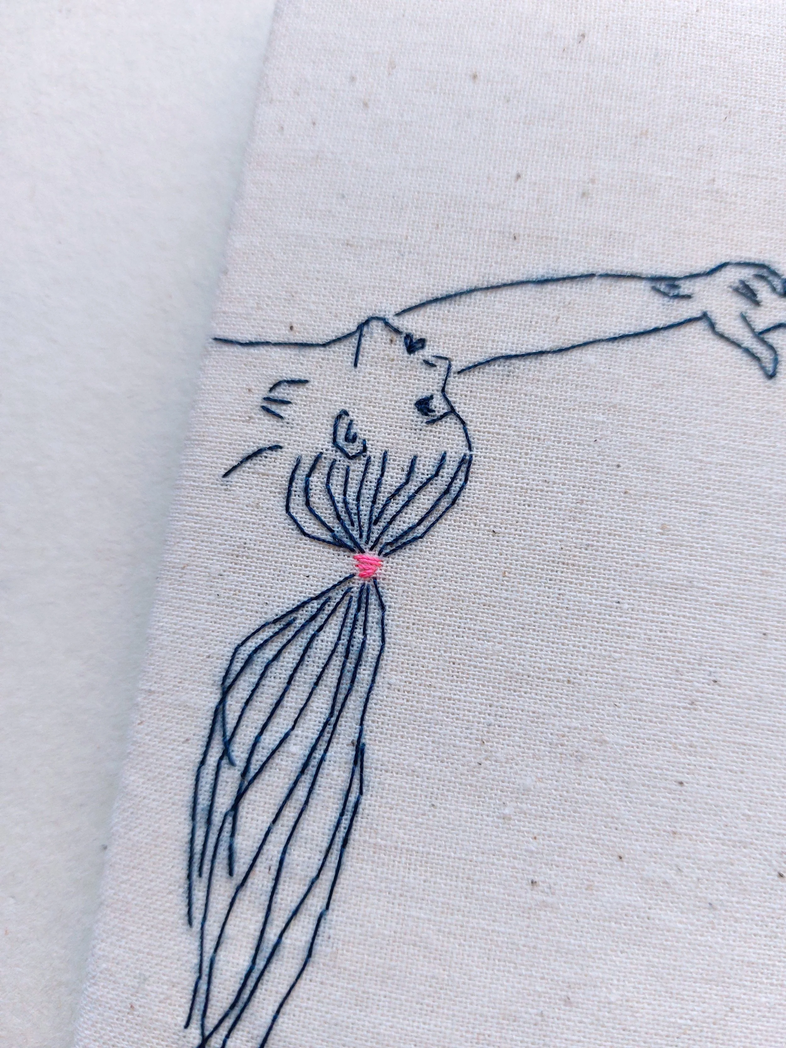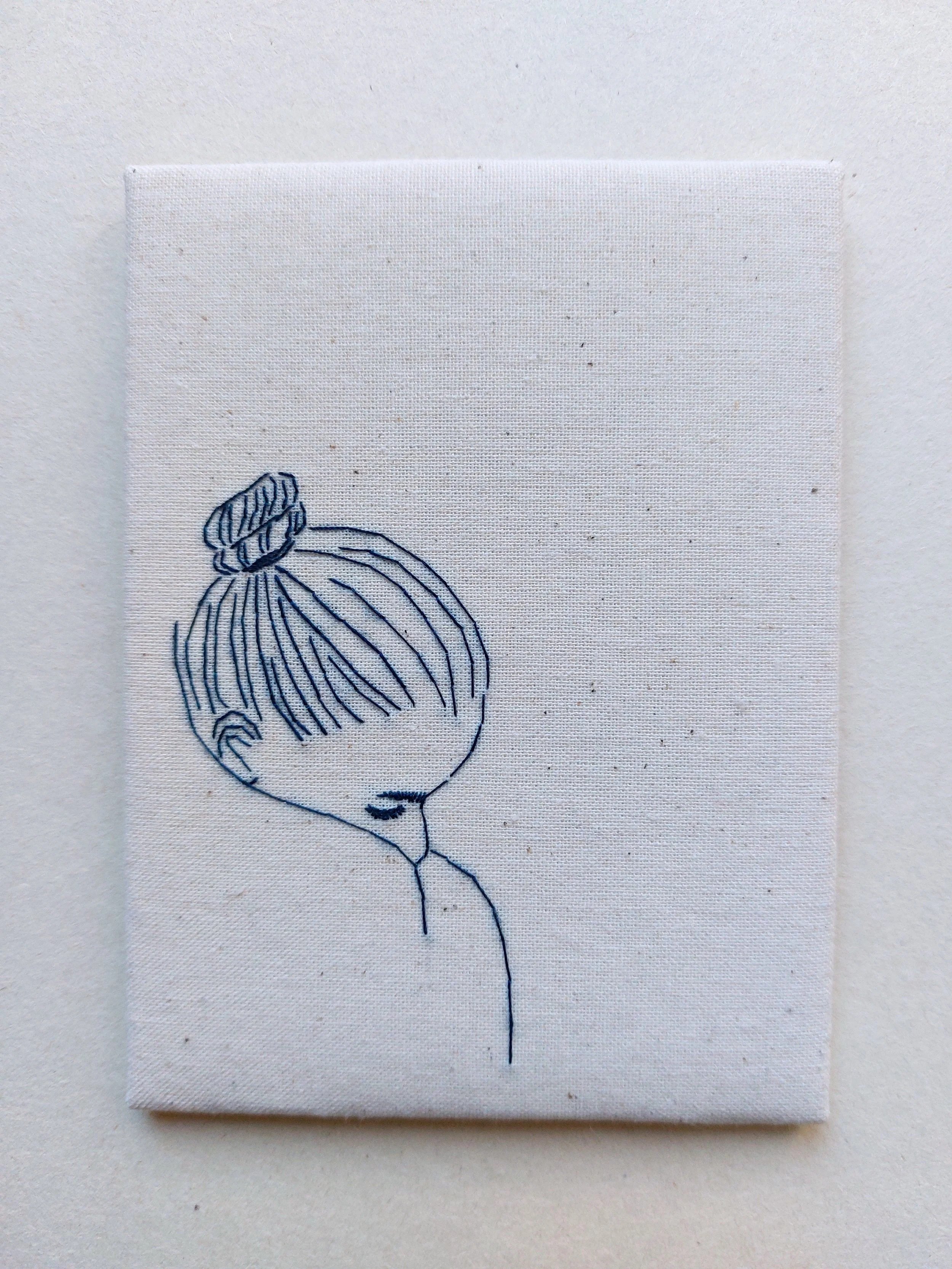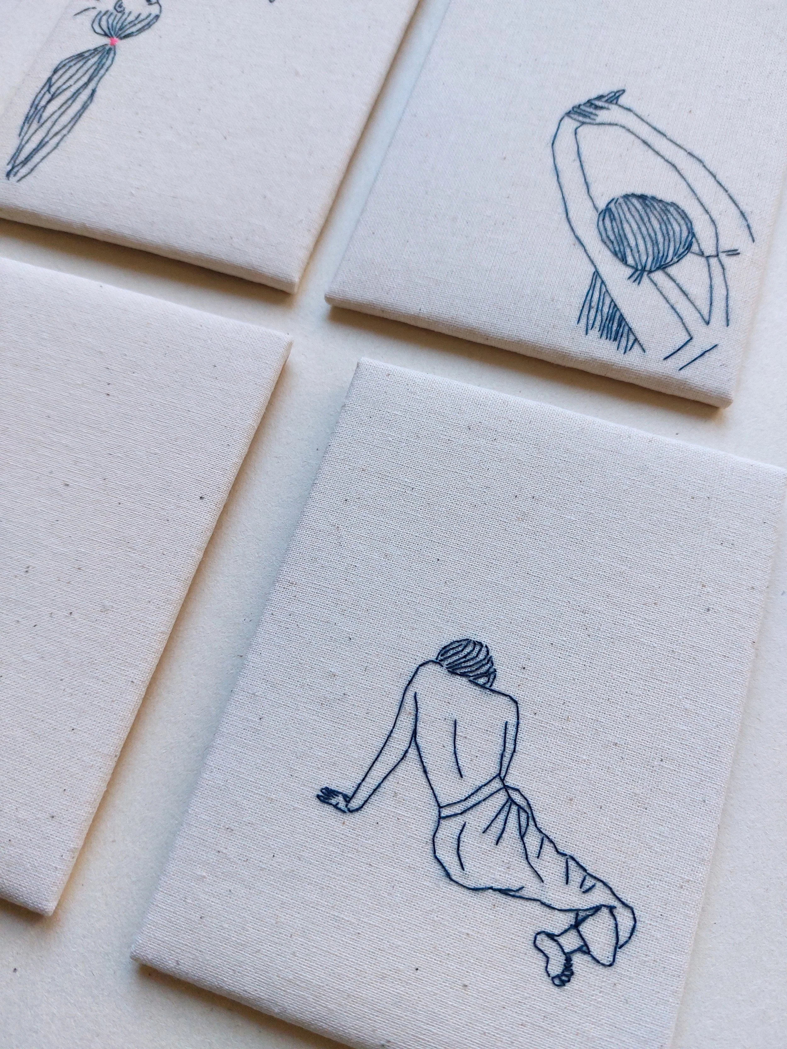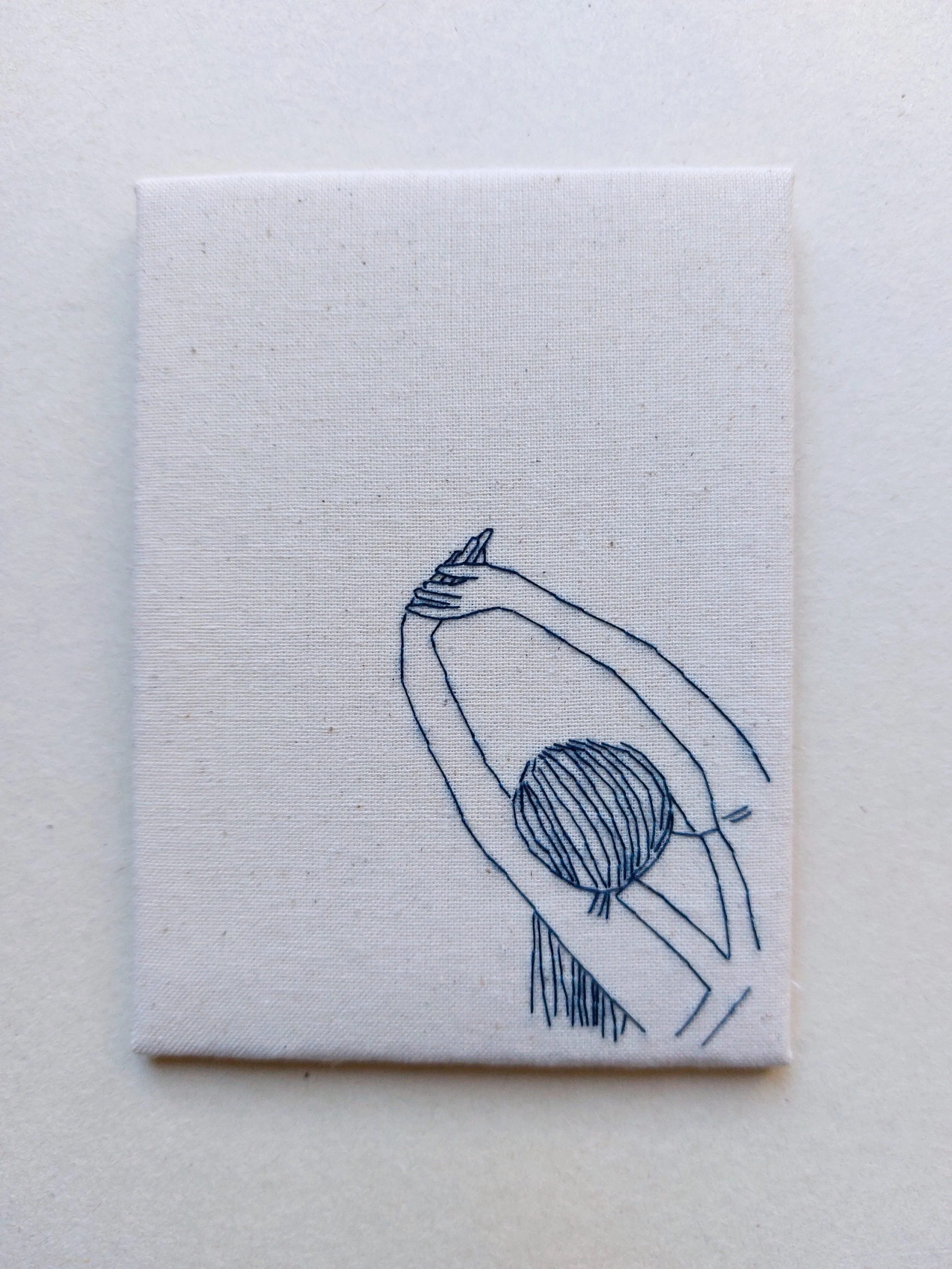 Cette broderie contemplative est réalisée à la main avec soin sur une toile de coton brut, sans traitement chimique. Le dessin brodé est effectué avec un fil de polyester bleu marine, une couleur à la fois sobre et intemporelle, qui apporte une élégance discrète à l’ensemble. Une fois la broderie terminée, elle est délicatement tendue et rigidifiée sur un carton de bois, ce qui assure une présentation soignée et un maintien parfait. Le tout est ensuite fixé à l’aide d’un adhésif et d’une bande de kraft gommé, pour garantir la stabilité et la pérennité de l'œuvre.