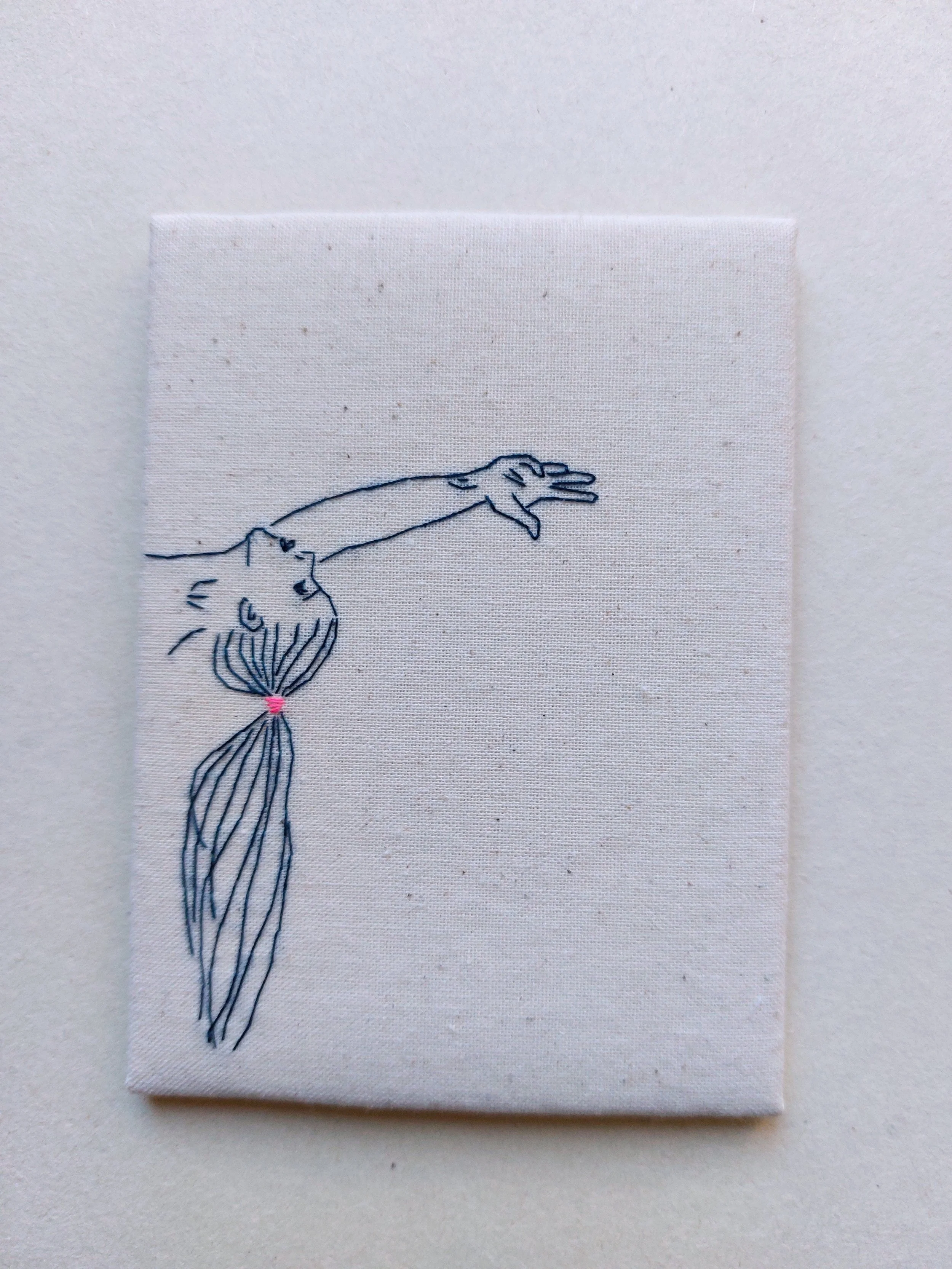 Dessin brodé d’une main en entraînant une autre, Viens je t’emmène.